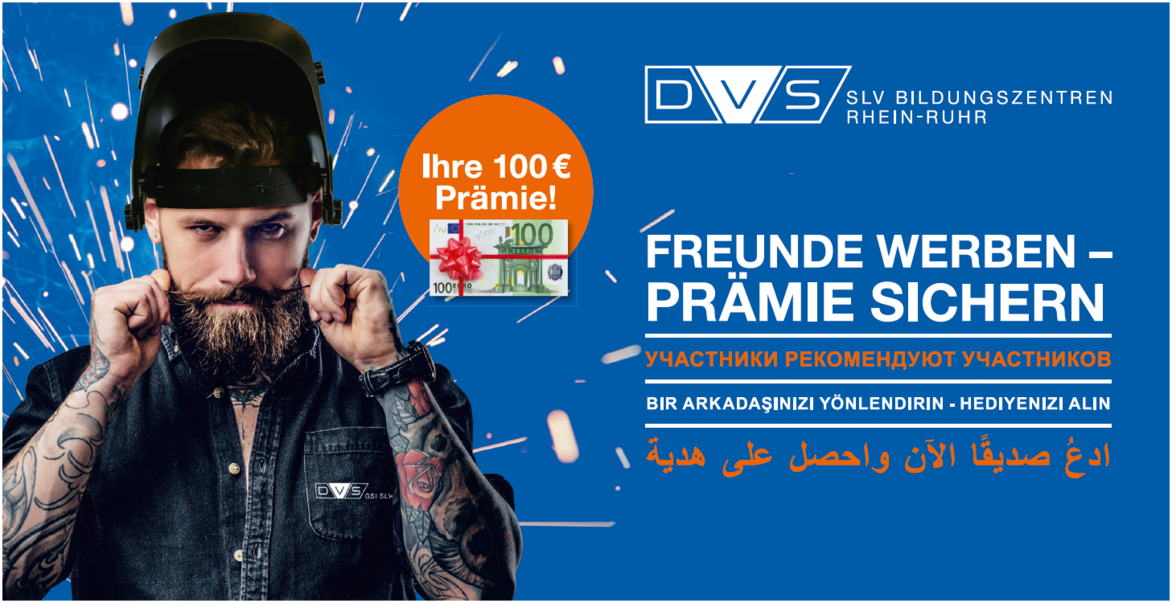 Die geworbene Person darf derzeit nicht Kunde bei uns sein. Die Anwerbung des neuen Kunden muss erfolgt sein, bevor der neue Kunde selbst oder eine andere Einrichtung (z. B. Arbeitsagentur, Jobcenter) einen diesbezüglichen ersten Kontakt mit uns aufgenommen hat. Die Anmeldebedingungen und Ausbildungsvoraussetzungen müssen für den geworbenen Kunden gegeben sein. Die Prämie erhalten Sie, wenn Sie neue Kunden für eine geförderte Weiterbildungsmaßnahme (z. B. Bildungsgutschein oder Aktivierungs- und Vermittlungsgutschein) anwerben. Die Auszahlung der Prämie erfolgt, wenn der angeworbene Kunde den Lehrgang erfolgreich 2 Monate lang besucht hat (kürzere Lehrgänge sind ausgeschlossen). Bitte nutzen Sie das Formular „Freunde werben - Prämie sichern“. Die Prämie von 100 € wird Ihnen bargeldlos auf Ihr Konto überwiesen. Diese Angebot gilt bis zum 31.12.2025. Der Rechtsweg ist ausgeschlossen.